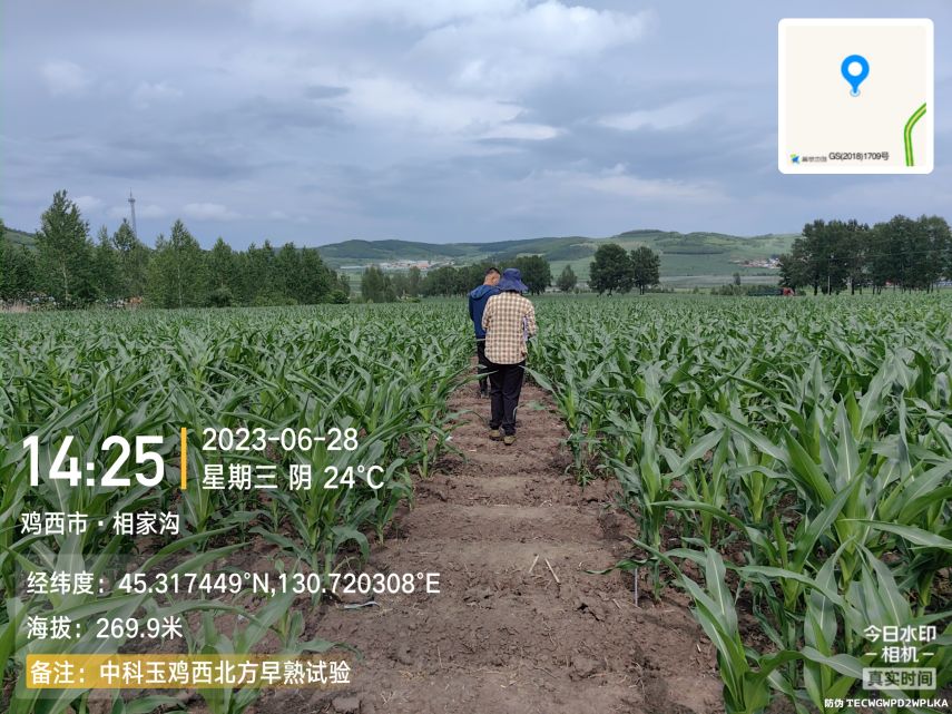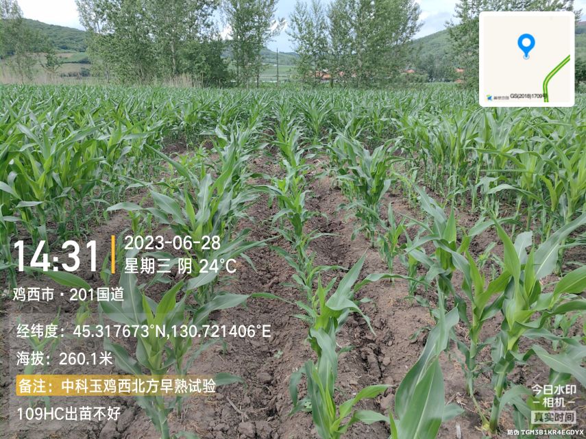 6月28日考察黑龍江雞西試點(diǎn)。試驗(yàn)點(diǎn)承擔(dān)北方早熟區(qū)域試驗(yàn)、生產(chǎn)試驗(yàn),交通較便利,田間規(guī)劃清晰合理,基本按照試驗(yàn)方案執(zhí)行,間隔道1.5米,地勢(shì)平坦,地力均勻,出苗較齊,有大小苗,個(gè)別品種缺苗移苗,密度滿足試驗(yàn)要求,綜合評(píng)價(jià)優(yōu)。