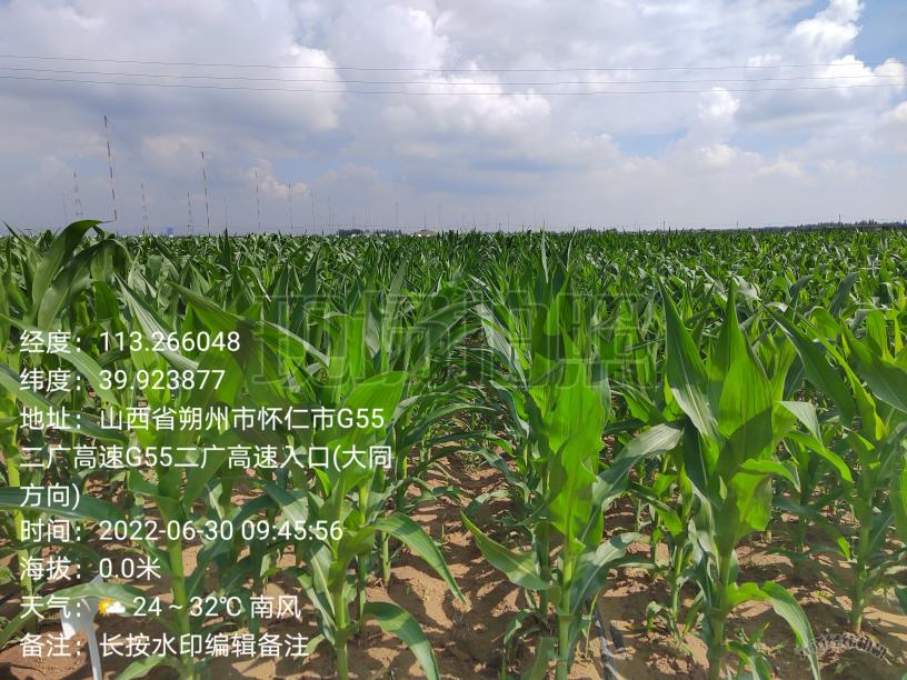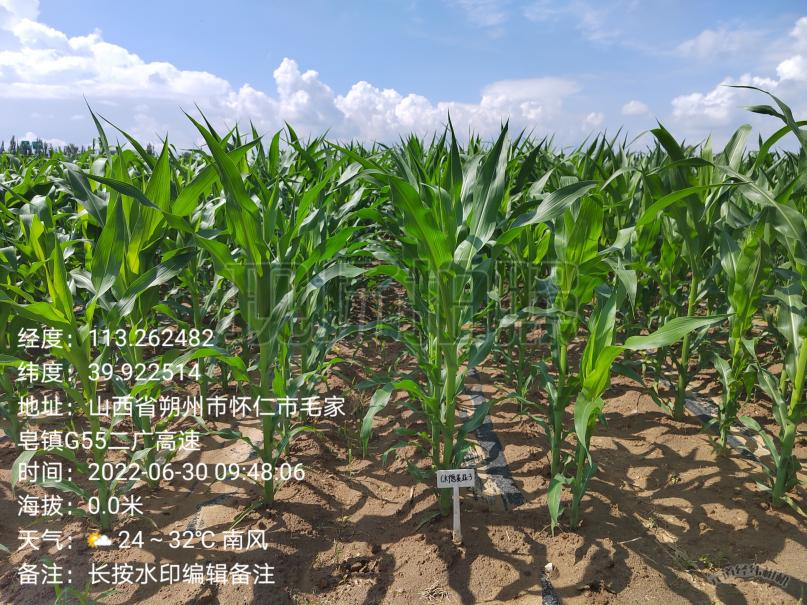 6月30日考察了山西省懷仁試點;試驗類型:北方早熟區試/生試;是由山西農業大學高寒區作物研究所承試;試點描述:播種后到6月1日前地溫偏低,但由于采取了地膜覆蓋種植,基本不影響玉米正常生長。出苗很好,個別品種出苗不均有大小苗,玉米展開葉片數11片。試驗人員專業負責,田間管理到位,長勢好。